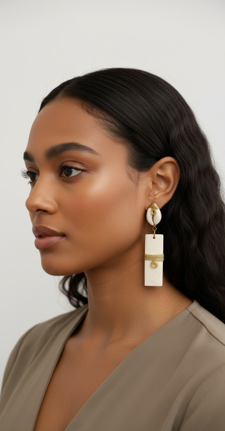Elevate your style with these bold and natural Cowrie Shell & White Stone Earrings. Handcrafted with love, these limited edition pieces feature brass wire details and a unique design. Perfect for adding a touch of culture to any look. Shop now at uniqueexoticjewelry.com.These earrings are sure to get you compliments